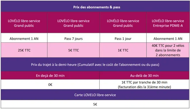 Le service de vélos à la demande se veut abordable pour tous les usagers afin d’inciter à l’utilisation de modes de déplacement plus doux, et de permettre à chacun d’avoir accès à une solution peu onéreuse et flexible. Ainsi, la tarification Lovélo VLS reprend la même base que l’offre Cy’Clic.