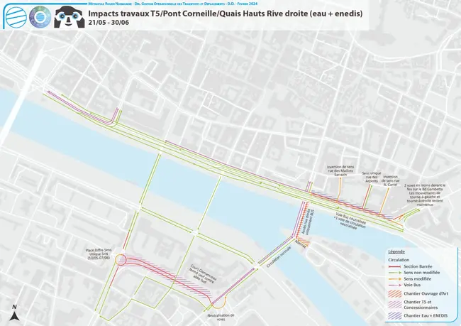 La Métropole Rouen Normandie profite de l’interruption du flux de véhicules venant du Pont Corneille vers la rive droite pour réaliser deux opérations simultanément d’une durée de 7 à 8 semaines à partir du 21 mai 2024 :