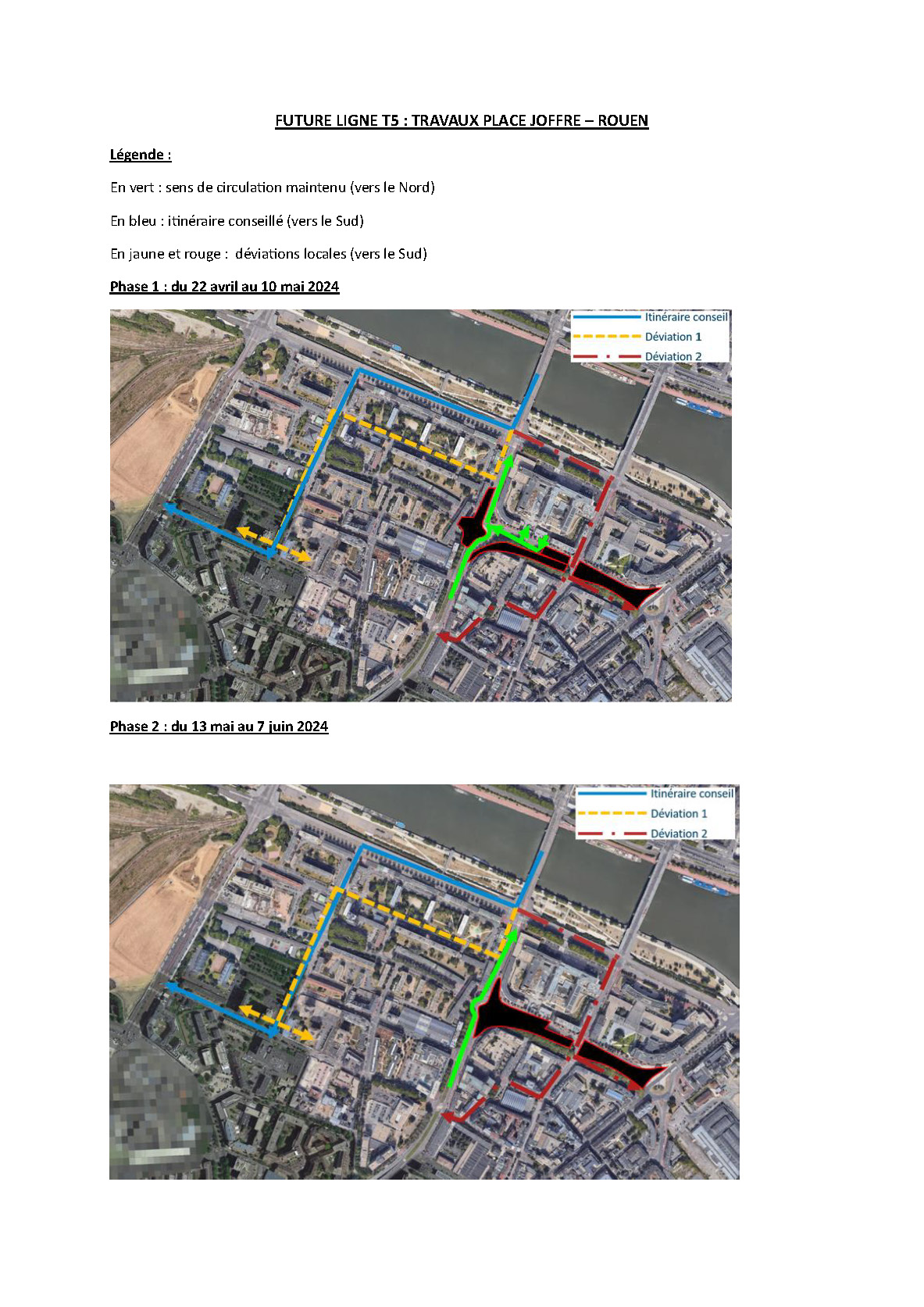 Les réseaux d’assainissement et d’eau potable vont être rénovés du 22 avril au 7 juin, en deux phases. Pendant cette période, la circulation sur la place Joffre sera limitée au seul sens de circulation, de la rive gauche vers la rive droite. Pour le sens rive droite vers rive gauche, une déviation sera mise en place depuis les quais hauts de la rive gauche par la rue Saint-Sever ou par la rue Poret-de-Blosseville, en fonction de la destination des automobilistes.